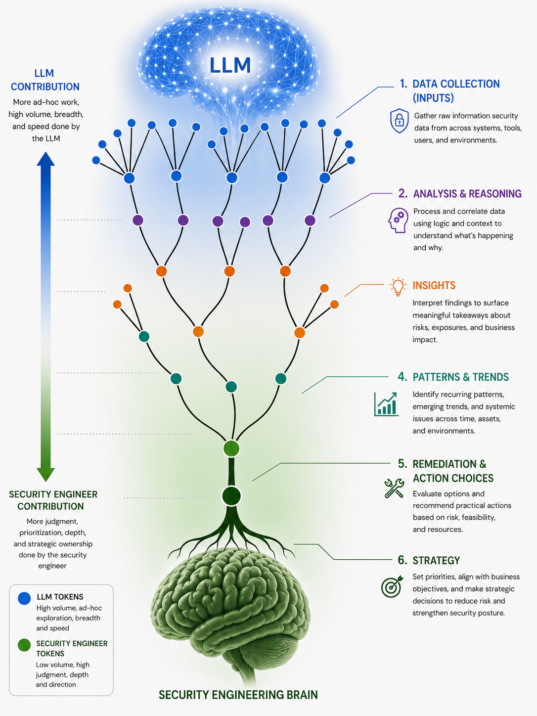The blue branches at the top are LLM tokens: high volume, ad-hoc, exploratory, broad, fast. The green roots at the bottom are security engineer tokens: low volume, high judgment, deep, directional. The work flows from raw signal at the canopy down to strategic posture at the root system, and the human contribution gets denser as you descend.